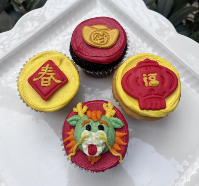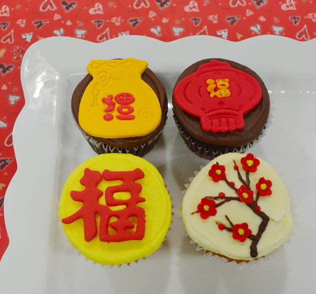 Celebrate Chinese New Year in Shanghai with festive cupcakes. Two chocolate and two vanilla cupcakes festively decorated to celebrate the lunar new year. Available through Chinese New Year.