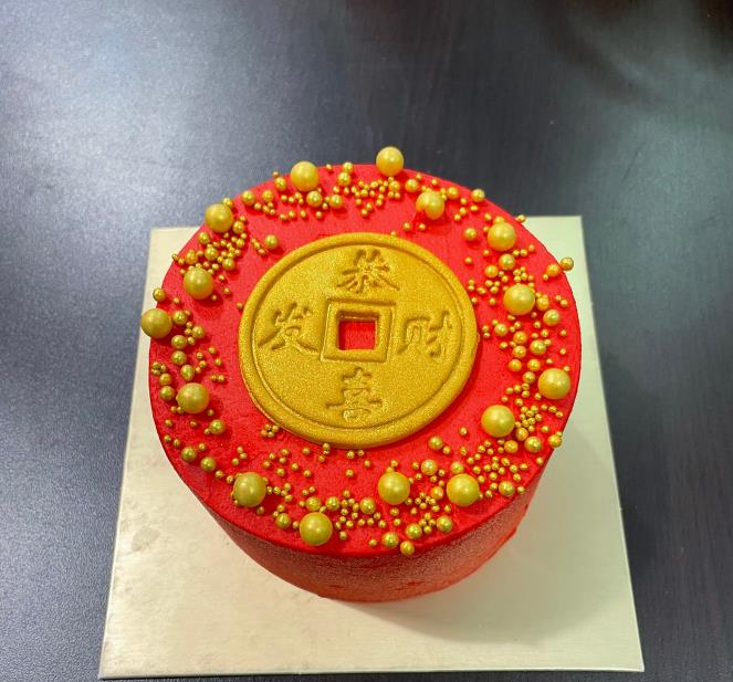 香草蛋糕外面裹一层黄色巧克力,福字可食用打印图+金色小糖珠做点缀。请提前至少2天预订。